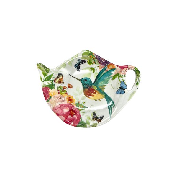Melamine teabag holder featuring a beautiful floral scene complete with a hummingbird and butterflies. Crafted from high-quality melamine, these teabag holders are not only elegant but also durable and resistant to breakage.
