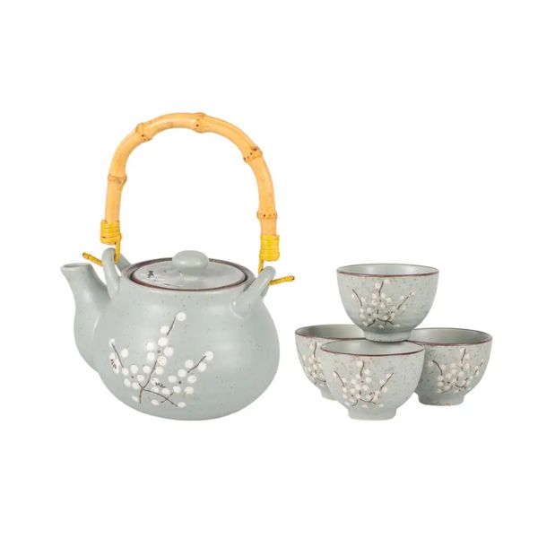 Elegant porcelain tea set with blossoms. Set includes 4 tea cups. Teapot comes with stainless steel strainer.