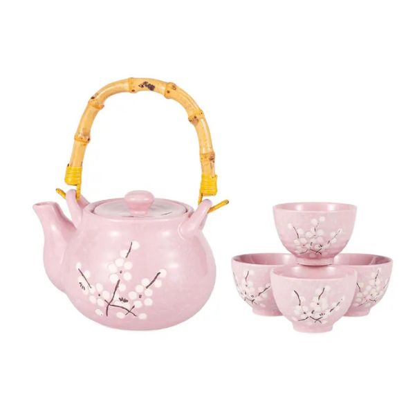 Elegant porcelain tea set with blossoms. Set includes 4 tea cups. Teapot comes with stainless steel strainer.