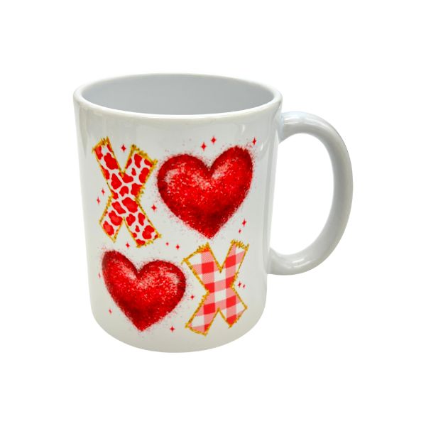 White ceramic mug featuring X's and O's (with the O's as hearts) printed on the front and back. A heart-warming addition to your mug collection and makes for a lovely gift! Approximately 11oz capacity.