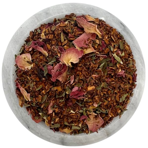 Rooibos Tea, Rosebuds & Petals, Stevia Herb, Peppermint & Caramel Flavoring