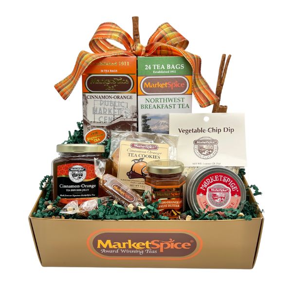 Included: MarketSpice Cinnamon-Orange 24ct Teabag Box, Northwest Breakfast 24ct Teabag Box,, MarketSpice Cinnamon-Orange 3.5oz Cookie Package, Cinnamon-Orange Apple Fruit Butter 2.4oz Jar and Veggie Chip Dip Packet.