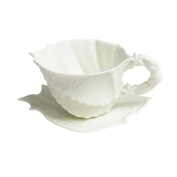 Ceramic shell-shaped teacup and matching saucer for a coastal touch at tea time! Teacup capacity is 6 fl oz.